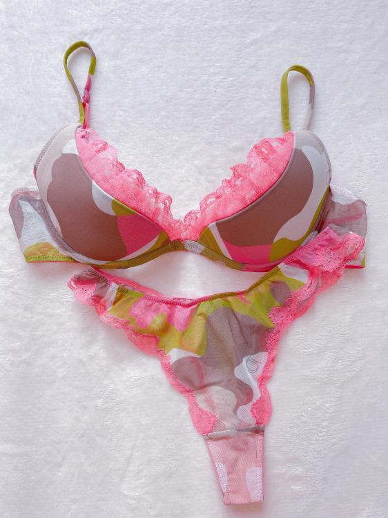 プリント生地のストレッチパワーネットとピンクのレースの組み合わせデザインがとってもモダンで美しいブラジャーです!カラーの組み合わせも品があり、肩紐もただの紐ではなく、プリントの生地で作られていて、細くて華奢で伸縮性のある、こだわりのあるデザインです。カップの被りが独特で、カップのしっかりした裏打ちは胸の半分以下くらいまでしか被りません。カップ上辺のレースとチュールでギリギリトップが隠れる程度ですので、薄手の洋服だとトップの凹凸が出てしまいます。笑