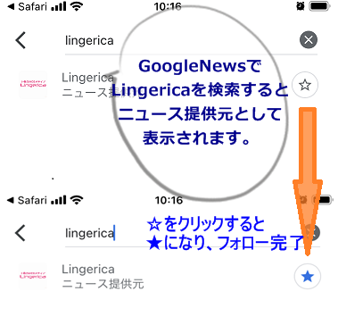 GoogleNewsでLingericaを検索して☆マークをクリックするだけでフォロー完了